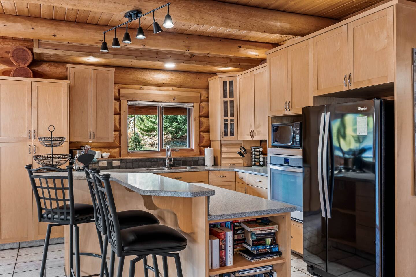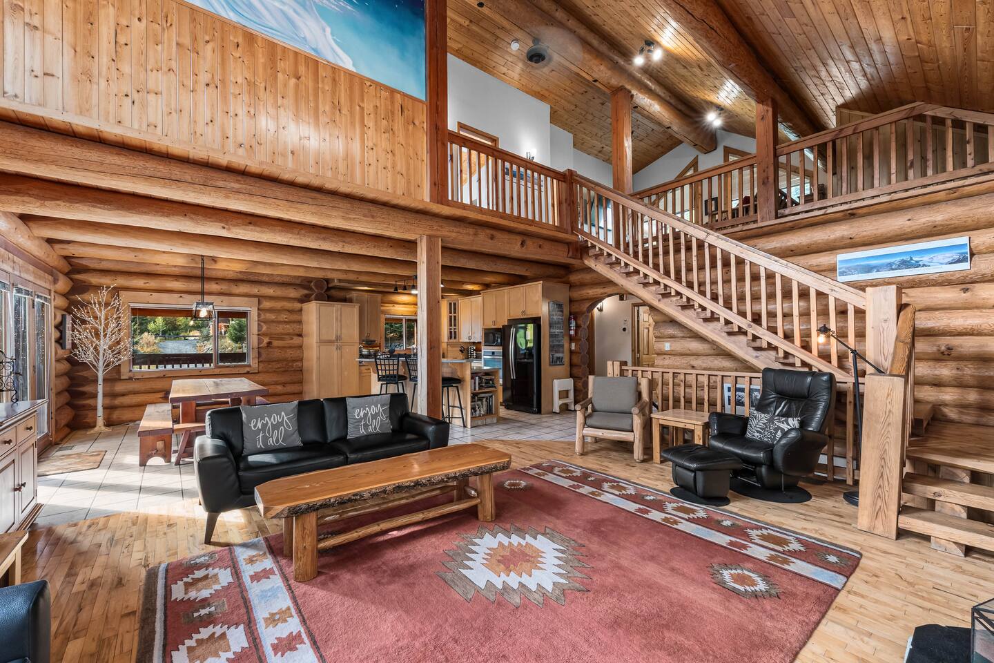 ✨ Key Features ☀ Sleeps up to 12: 3 Queen beds, 1 Double bed, 2 Twin bunks + 2 futons (total of 10 sleeping spots) ☀ 2.5 Bathrooms: Full baths on main & upper level, plus a 2-piece bath in the basement ☀ Open-concept living: Kitchen, dining, and great room with vaulted ceilings & log cabin charm ☀ Loft lounge: Open space with TV and futons for games, movies, or relaxing ☀ Private hot tub: Accessible directly from the basement bunk room ☀ Wraparound deck: Mountain views, Adirondack chairs, and access from dining area & entry ☀ Cozy fireplace: Stone hearth centerpiece for après-ski evenings ☀ Prime location: Minutes from Sun Peaks Village, ski lifts, hiking, and biking trails 🛏 Bedrooms Main Floor Queen Comfortable queen bed with cozy linens, steps away from the main full bath. Upper-Level Queen Bedrooms Two inviting queen bedrooms, each with balcony access and full storage—perfect for couples or friends. Bunk Room (Basement) Sleeps up to 5 with 1 double bed and 2 twin bunk beds. Direct access to the hot tub and a convenient 2-piece bathroom. 🛁 Bathrooms Main Floor: Full bath with shower, bathtub, dual sinks, and toilet Upper Level: Full bath with shower, bathtub, dual sinks, and toilet Basement: 2-piece bath (toilet + sink) for convenience near bunk room and hot tub 🍽 Kitchen & Dining Kitchen Fully equipped open-concept kitchen with appliances, cookware, and essentials. Island seating makes casual meals easy. Dining Area Seating for 8 with mountain views and direct access to the wraparound deck. 🛋 Living Spaces Great room with vaulted log-beam ceilings Stone fireplace for cozy evenings Sofas and seating for family gatherings Open loft lounge with futons and TV for extra hangout space 🌲 Outdoor Space ☀Private hot tub ☀Wraparound deck with Adirondack chairs and scenic views ☀Balcony access from two upstairs queen bedrooms ☀Driveway parking available 📍 Location Highlights Sun Peaks Village & ski lifts – 2 min Restaurants & cafés – 3 min Hiking & biking trails – steps away Kamloops – 45 min drive Kamloops Airport (YKA) – 55 min drive
